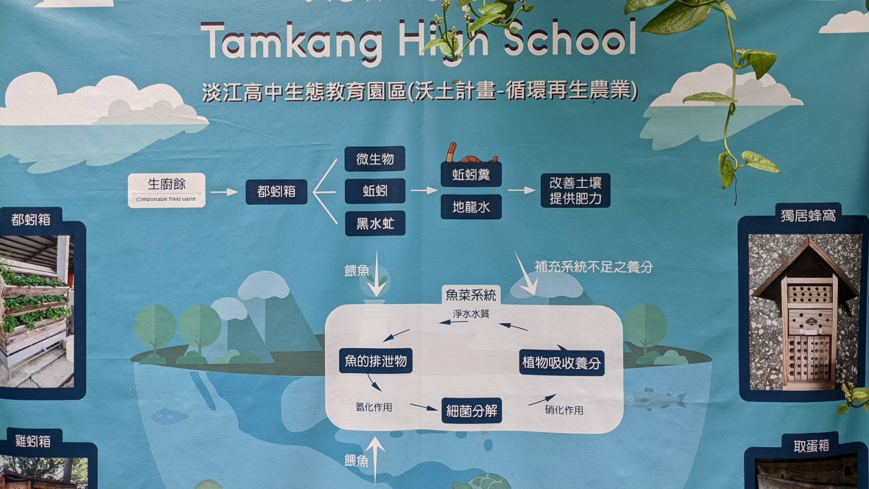 魚菜共生系統其實是常見的循環系統,並不稀奇,但如何結合校園場域,讓這個系統具有教育價值,就需要一些巧思與創意,其中結合了水循環、生態系、食物鏈與營養鏈的串聯,是一套完整的生命與永續教育。這些系統就遍佈在淡中校園各處,有些在校園角落、有些在校園魚池裡、小橋邊,有些則在校門口的樹林間,有魚、有雞、有鳥、有烏龜、有黑水蠓、有蚯蚓,看完一整套系統的同時,也完整走訪校園的各角落。平時不同科目的老師帶著學生從不同的角度觀察、計算、討論、操作這個系統的運作,不僅認識了循環、體會了永續,也感受了生命教育的意義。